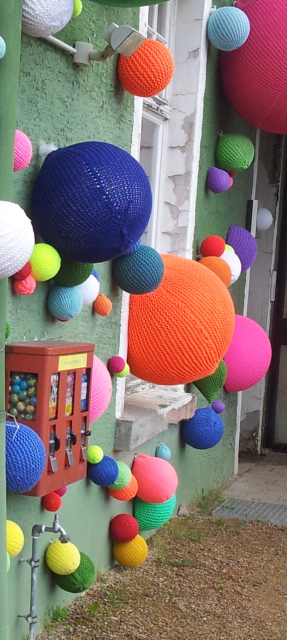 “Kaugummi-Automat” mit gestrickten “Blasen” am sogenannten “Grünen Haus”, das im Oktober abgerissen werden soll