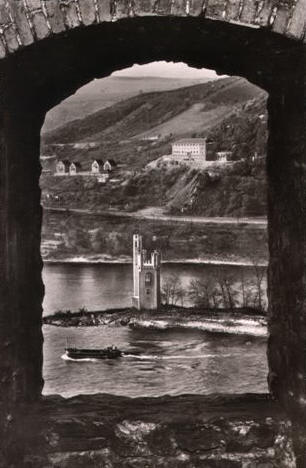 Blick von der anderen Rheinseite auf Mäuseturm und Bingerbrück (Jugendherberge ) vermutlich 50er Jahre