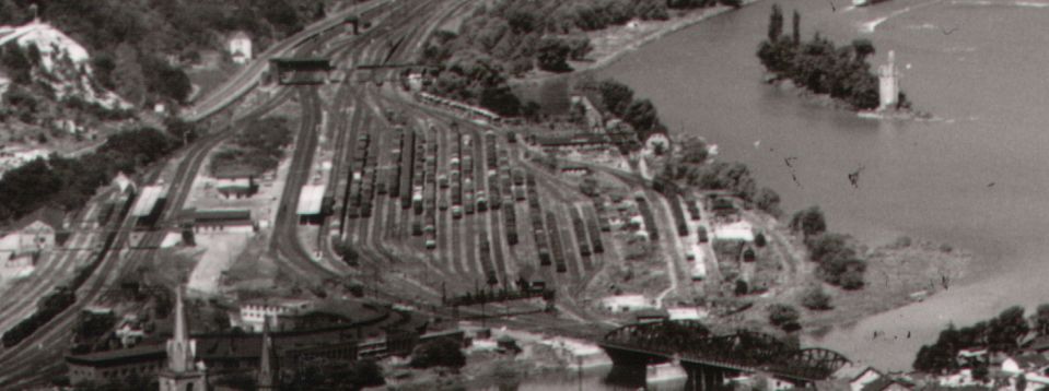 Blick auf Bahnanlagen, Nahemündung, Rhein und den Mäuseturm (60er)
