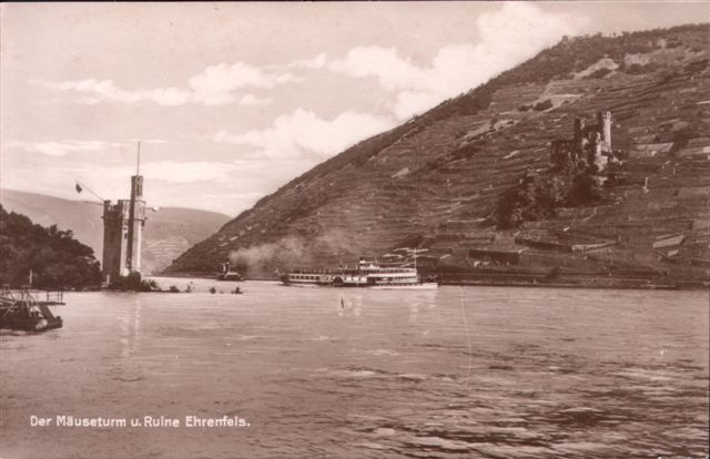 1939  Im Eiswinter 1929: Blick vom Binger Rheinufer auf Mäuseturm und Ehrenfels Rechts Schildfragment "Binger Loch - Zum Mäuse (turm)...."  Schöne Jugendstilkarte (postal. gel. 1902): Mäuseturm, Anlegestelle und Trajektboot  1929 Reklamemarke "DER RHEIN BEI BINGEN" - Designer Böttcher - 1913  1905 Grafik aus einem Buch 1920  1904 (Anlegestelle Trajektboot) Trajektboot (entweder die "Rüdesheim" oder "Bingerbrück") 20er Jahre?