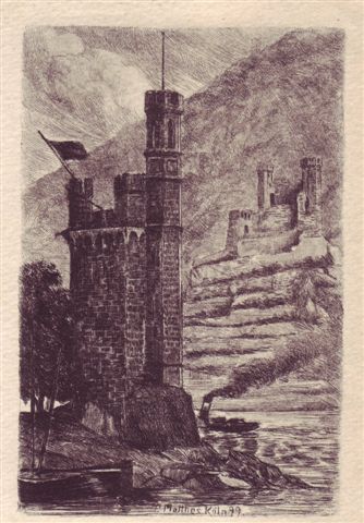 schöne alte Radierung - vermutlich ca. 1920 Lithografie von 1900  Große Überraschung: bei der Karte von ca. 1900 entdecke ich einen Hinweis oben rechts, der lautet: "Gegen das Licht halten!" und prompt erscheint Bischof Hatto, der von Mäusen angefallen wird (gemäß der Sage - siehe Foto!)  Lithografie von ca. 1900