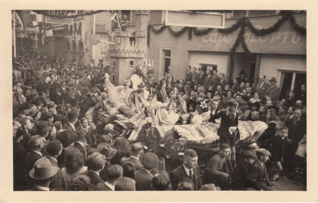 Beschriftung auf der Rückseite: Winzerfestumzug in Bingen 30er Jahre Ich vermute aber (angesichts der dick vermummten Menschen am Straßenran),, dass dies eher ein Fastnachtsumzug war)** **Wie ich jetzt erfahren habe, war es tatsächlich ein Winzerfestumzug. Danke für die Richtigstellung, Frau Tabarelli!