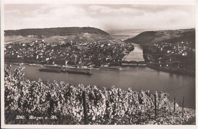 Blick von Rüdesheimer Seite über die Hindenburgbrücke hinweg nach Bingen Karte vermutlich aus den Jahren 1930 bis 1945. Die Hindenburgbrücke wurde im zweiten Weltkrieg (März 1945) durch die Deutschen selbst zerstört, die damit das Vorrücken der Amerikaner behindern wollte.