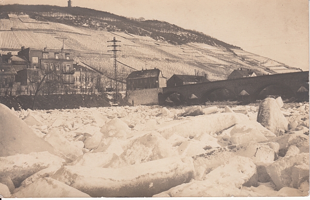 Eis auf der Nahe vor der Drususbrücke 1929